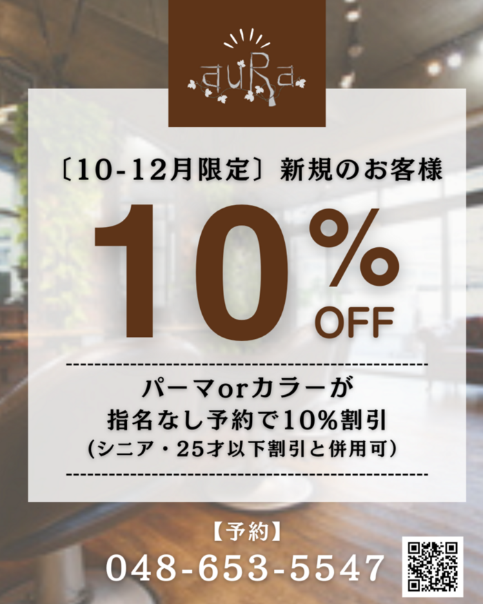 【auRa】新規のお客様限定 パーマ・カラー10%OFF
